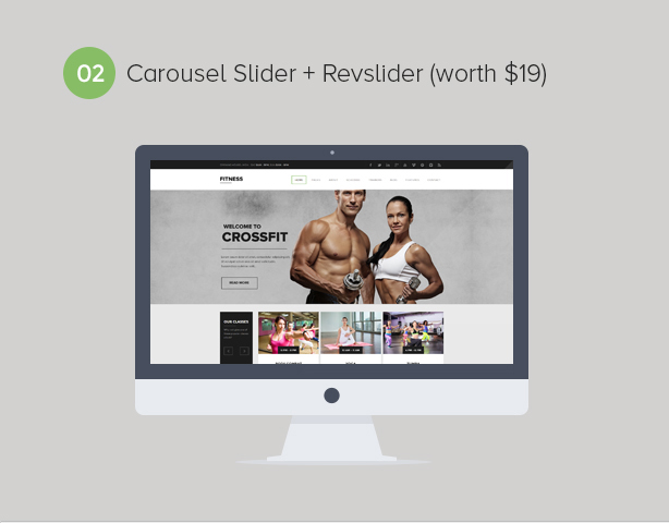 Fitness comprend des styles de couleur illimités, des widgets personnalisés, des fonctions tactiles et de balayage activées, RevSlider (valeur de 19 $) et plus.